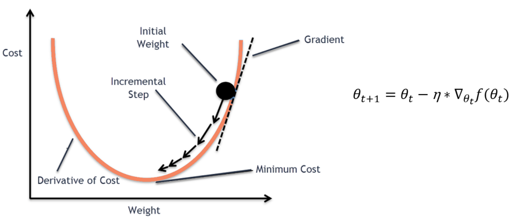 경사하강법은 경사를 따라 내려가면서 weight를 업데이트해 Minimum값을 찾는 방법입니다. 경사는 함수의 최대 증가방향 기울기 벡터를 의미합니다. weight의 변화에 따른 cost의 증감을 이용하여 cost가 작아지는 방향으로 학습을 진행합니다. 수식적으론 weight값에 기울기에 learning rate를 곱한 값을 빼는 것으로 weight값을 갱신합니다. 이는 기울기가 감소하는 방향으로 weight를 갱신시키는 것이 cost값을 낮출 수 있기 때문입니다.
