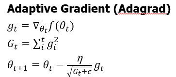 learning rate에 민감하다는 단점을 해결하기 위하여 고안된 것이 Adagrad입니다. 고정된 learning rate를 사용하는 것이 아니라 상황에 맞게 learning rate값을 다르게 학습하는 방법입니다. 이전 step에서의 기울기들의 제곱을 모두 합하여 분모에 둠으로써 learning rate값이 처음에는 크게 나중에는 작게하여 학습을 더 효율적으로 할 수 있게 합니다.