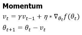 국소적인 최소점(local minimum)에 빠지는 단점을 해결하기 위한 방법으로 고안된 것이 momentum입니다. momentum은 물리에서는 운동량이라는 뜻으로 관성처럼 기존의 momentum(이전 gradient값)과 현재의 gradient값을 모두 고려해서 local minimum에 빠지지않고 지나칠 수 있도록 도와주는 방법입니다. Momentum은 현재 parameter 위치에서 gradient를 계산하고 현재의 모먼트 Vt를 구하여 momentum만큼 업데이트합니다.