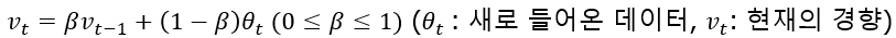 예를 들어 베타값이 0.9라고 한다면 과거의 경향성에 0.9, 새로운 경향성에 0.1을 곱하여 더해주는 것으로 10일간의 데이터를 활용하여 평균을 취해주는 것과 같은 역할을 한다고 생각할 수 있습니다.