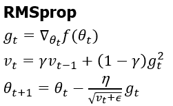 하지만, Adagrad의 경우 학습이 진행됨에 따라 Gt값이 너무 커져 나중에는 학습이 거의 되지 않는다는 단점이 있습니다. 이를 해결하기 위해서 Adagrad에 지수가중평균의 개념을 도입한 방법이 RMSprop입니다.