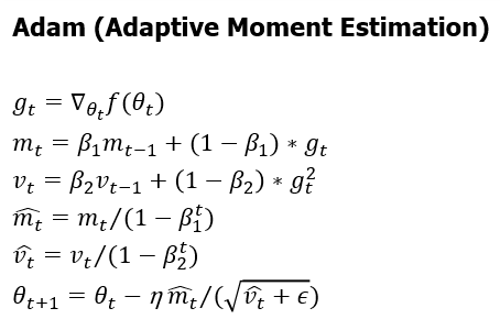 Adam(Adaptive Moment Estimation)은 Momentum과 Adaptive Gradient를 모두 활용하는 방법이다. 경사하강법이 가지고 있는 두가지 문제점인 local minimum에 빠질 수 있다는 문제와 learning rate에 민감하다는 문제를 모두 해결하려 노력한 방법으로 Momentum과 Adaptive Gradient와 지수 가중 평균과 편향 보정을 활용하여 현재에 가장 많이 사용되는 최적화 기법입니다.