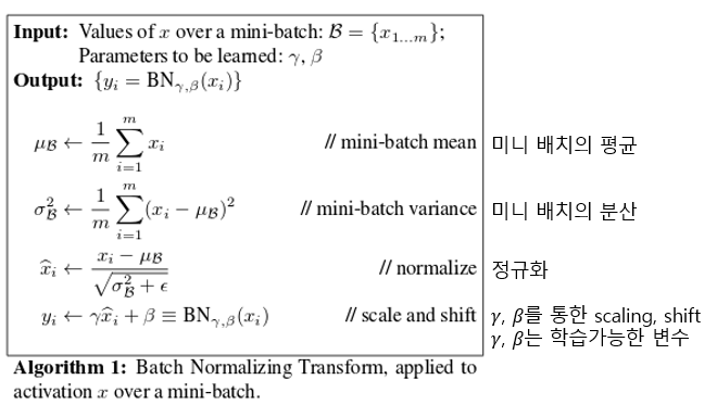 배치 정규화는 위의 Internal Covariate Shift문제를 해결하기 위한 방안으로 각 배치별로 평균과 분산을 이용하여 정규화하는 것입니다. 이때, 감마와 베타를 learnable parameter로 두어 scale과 shift를 학습합니다.