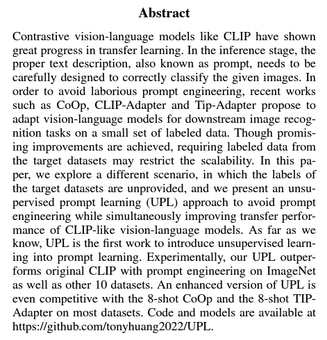 • We present an Unsupervised Prompt Learning(UPL) framework to avoid time-consuming prompt engineering and better adapt vision-language models for downstream image recognition task. UPL is the first work to introduce unsupervised learning into prompt learning of vision-language models.
