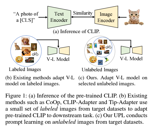 저자는 Target 데이터셋에 대한 추가 annoation 필요성을 줄이고, 광범위한 hand-crafted prompt engineering을 피하고자 Unsupervised Prompt Learning(UPL) framework를 제안하게 됩니다.