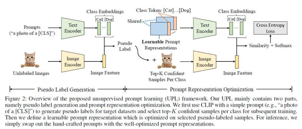 계속해서 이야기하고 있지만 UPL의 목적은 광범위한 prompt engineering을 없애고, target 샘플들에 대한 label 없이 CLIP의 사전학습 표현력을 transfer하는 것입니다. 이를 위해 UPL은 두 가지 모듈로 구성되어 있습니다. 첫 번째는 unlabeled sample들에 대한 pseudo label generation 과정, 두 번째는 pseudo labeled sample들을 이용한 prompt representation optimization 과정입니다.