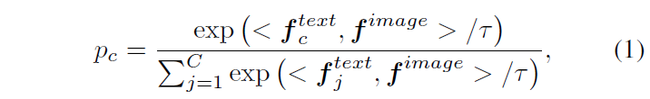 영상 I도 마찬가지로 CLIP image encoder에 통과시켜 f^{image}를 얻을 수 있을 것입니다. CLIP의 사전학습 과정이 f^{image}f^{text}를 공통의 embedding space에 투영시키는 것이었으므로 둘 간의 cos 유사도(<\cdot{}, \cdot{}>)를 기준으로 현재 이미지 I가 각 클래스의 text embedding과 response되는 정량적 값 p_{c}를 아래 수식 (1)과 같이 얻을 수 있습니다.