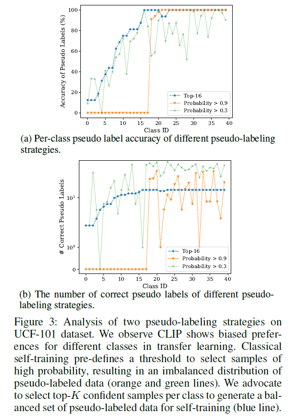 그림 3-(a)는 pseudo-labeling 전략(top-16, 0.9 thresholding, 0.3 thresholding)별 pseudo label의 정확도, 그림 3-(b)는 실제 라벨과 동일한 pseudo label의 개수를 보여주고 있습니다. 그림 3-(a)에서 0.9 threshodling을 하는 경우 앞쪽 클래스(낮은 class ID)들의 pseudo label은 거의 0%에 가까운 정확도를 보이고, 뒤쪽 클래스들은 거의 100%에 가까운 정확도를 보여주며 CLIP의 사전학습 표현력이 UCF101 데이터셋 클래스들에 대해서는 편향된 preference를 보여주는 것을 알 수 있습니다. 또한 0.3 thresholding 하는 경우 0.9 thresholding에 비해 정확도의 편향성은 좀 덜하지만 그림 3-(b)에서 알 수 있듯 정확한 샘플의 절대적 개수는 여전히 클래스 별로 큰 편차를 보이는 것을 알 수 있습니다. 이는 양질의 sample 관점에서는 class imbalance를 불러올 수 있겠죠. 그리고 무엇보다 0.3 이상의 score를 가지는 sample들이 모두 높은 quality를 보장해준다고 보기에는 어렵습니다.