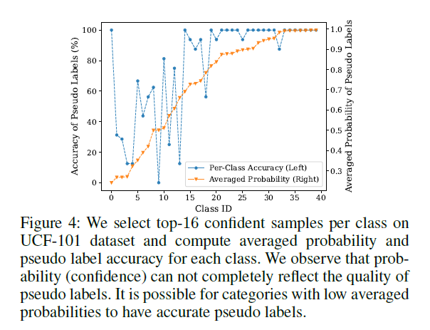 그렇다고 저자들이 pseudo label의 quality를 높이기 위한 별다른 모듈을 제안하는 것은 아니고, thresholding 대신 top-K 샘플링 전략을 취하는 것이 전부입니다. 그림 3을 보시면 위 분석에 대한 근거를 확인할 수 있습니다. 우선 UCF101의 클래스 개수는 101개인데 그림엔 40개 정도로 나와있는 이유가 명확하게 설명되어 있지는 않지만, 일단 저자가 이야기하려는 바를 살펴보겠습니다.