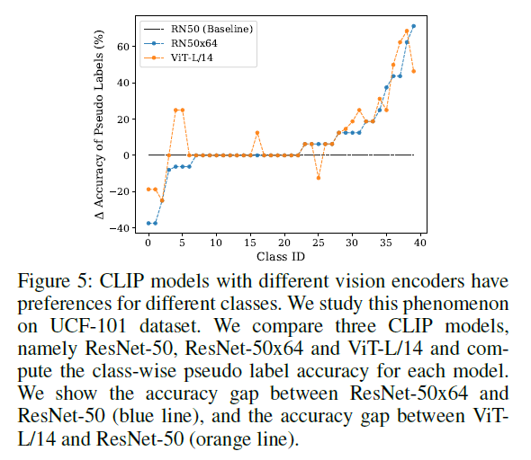 마찬가지로 UCF101 데이터셋에 대해, 그림 5는 RN50이 예측한 클래스 별 pseudo label 정확도를 기준으로 하였을 때 RN50x64와 ViT-L/14 각각의 예측 pseudo label 정확도 편차를 나타내고 있습니다. 대체적으로는 유사한 경향성을 보인다고 생각이 들지만, 명백히 모델에 따라 클래스 별 정확도의 편차가 존재하는 것은 사실입니다.
