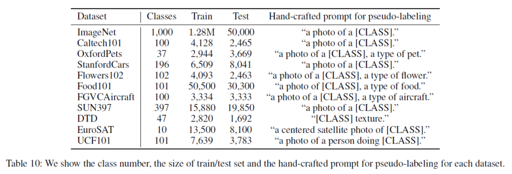 CLIP 논문과 동일한 11개의 데이터셋을 사용했고, 각 데이터셋의 특성은 위 표 10과 같습니다.