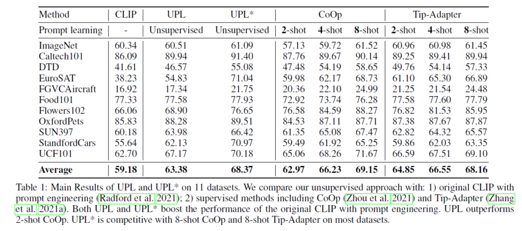 • Our UPL significantly outperforms original CLIP with prompt engineering on ImageNet and other 10 image classification datasets by large margins.