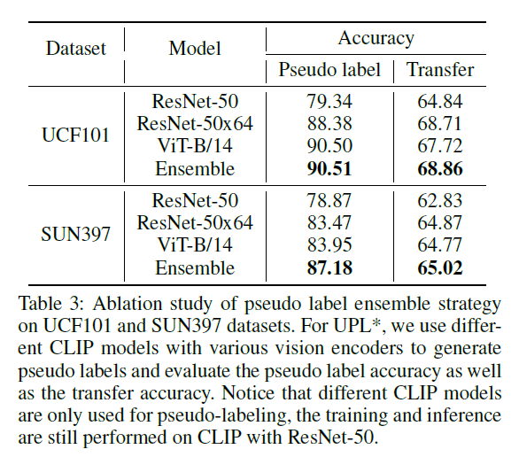 표 3은 데이터셋에 따라 backbone 별 pseudo label 정확도 및 inference 시 성능을 보여주고 있습니다. 우선 pseudo label의 정확도와 실제 transfer 시 정확도가 완전한 상관관계를 가지고 있지 않다는 것을 알 수 있습니다. 또한 backbone에 따라 성능의 경향성이 어느정도 보이긴 하지만 각 backbone으로 얻을 수 있는 확률을 ensemble하여 pseudo label을 만드는 \text{UPL}^{*}이 언제나 성능 향상을 불러오는 것을 확인할 수 있었습니다. 더 큰 backbone도 사용하였다고 밝혔는데, 이들에 대한 성능이 없어 아쉽습니다.