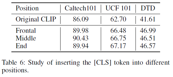 표 6은 그리 중요한 실험은 아니지만 혹시 궁금해하시는 분들이 계실까봐 담았습니다. 수식 (3)에 따르면 CLIP text encoder에 들어가는 문장 가장 마지막에 class embedding이 들어가는데, 이에 대한 데이터셋 별 성능입니다. Class embedding의 위치에 따라 성능이 크게 변화하지 않는다는 점을 통해, 저자는 UPL이 class embedding 위치에 관계 없이 다양한 영상에 강인한 learnable prompt를 만들어낸다고 주장합니다.