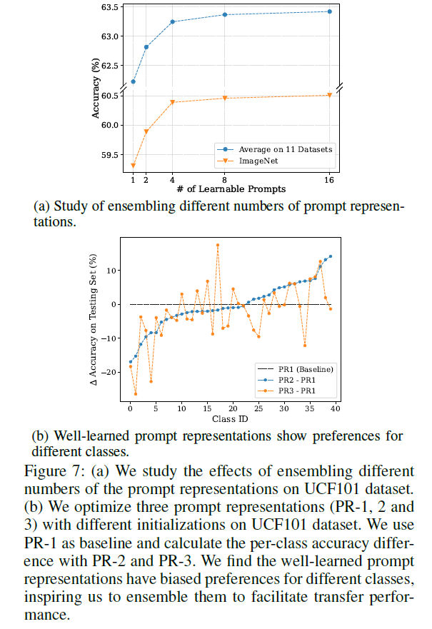 그림 7은 위 2.3.2에서 설명한 prompt ensemble 기법의 분석 결과입니다. 그림 7-(a)는 여러 개의 prompt를 최적화시키고 ensemble하는 경우 성능이 계속 오르지만 N=16에서 어느정도 수렴하는 것을 볼 수 있습니다. 그리고 그림 7-(b)는 prompt N개 중 잘 학습된 3개의 inference 정확도 편차를 나타낸 것입니다. 3개의 prompt는 모두 유사하게 초기화되었지만 PR1을 기준으로 PR2, PR3는 각각 클래스 별 큰 정확도 편차를 보여주기에 안정적인 성능을 위해 여러 prompt의 ensemble이 반드시 필요하다는 점을 보여줍니다.