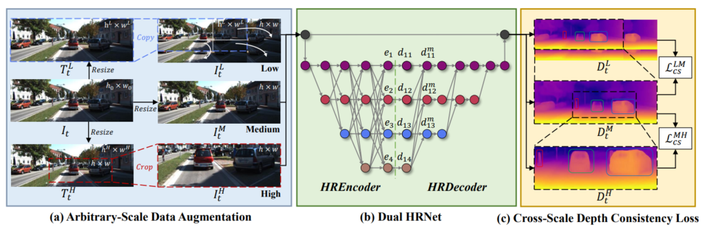 다음은 Cross Scale Depth Consistency loss에 대한 부분입니다. 사실 해당 loss가 제가 개인적으로 생각하였을 때는 가장 중요한 contribution이 아닐까 싶습니다. 먼저 저희가 데이터 증강 기법을 통해서 I_{t}^{L}, I_{t}^{M}, I_{t}^{H} 을 만들었으며 Dual HRNet이라는 깊이 추정 모델에 입력으로 넣어서 각각 D_{t}^{L}, D_{t}^{M}, D_{t}^{H} 이름의 depth map을 생성하였습니다.
