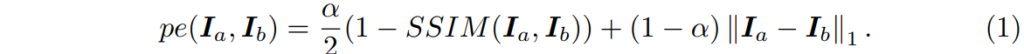 그 다음에는 Self-supervised monocular depth estimation의 기본 학습 방식인 photometric loss를 통한 학습이 진행됩니다. photometric loss란 쉽게 말해 아래 수식 1과 같이 두 영상 사이에 픽셀 오차를 계산하는 것입니다.