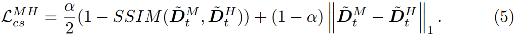 따라서 I_{t}^{L}, I_{t}^{M}, I_{t}^{H} 은 모두 정확히 동일한 카메라 위치에서 동일한 대상을 촬영한 영상이기 때문에 이들의 외적으로 보이는 scale이 다 달라도 추론되는 깊이 값은 모두 같다고 볼 수 있습니다. 따라서 논문에 저자도 이를 의식하고, D_{t}^{L}, D_{t}^{M}, D_{t}^{H} 에 대하여 모두 같은 값을 가져야만 한다~라는 식으로 loss를 설계하였으며, 이를 Cross-scale Depth consistency loss라고 합니다.