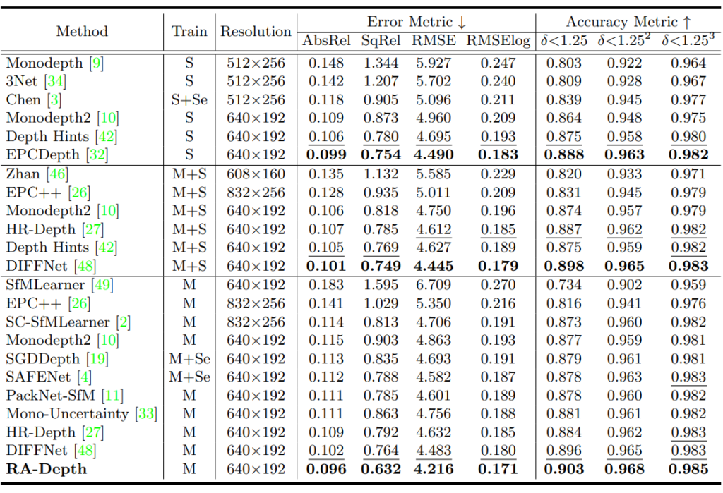 위에 표는 KITTI Dataset에 대하여 정량적 성능을 리포팅한 것으로, Train에 S, Se, M은 각각 학습 때 사용한 데이터의 종류로써 Stereo, Segmentation, Monocular video를 의미합니다. 그냥 가장 중요하게 보실 점은 맨 아래 M으로만 학습한 평가 세팅을 살펴보시면 되며, 여기서 RA-Depth가 가장 좋은 성능을 달성했다는 것을 살펴보시면 됩니다.