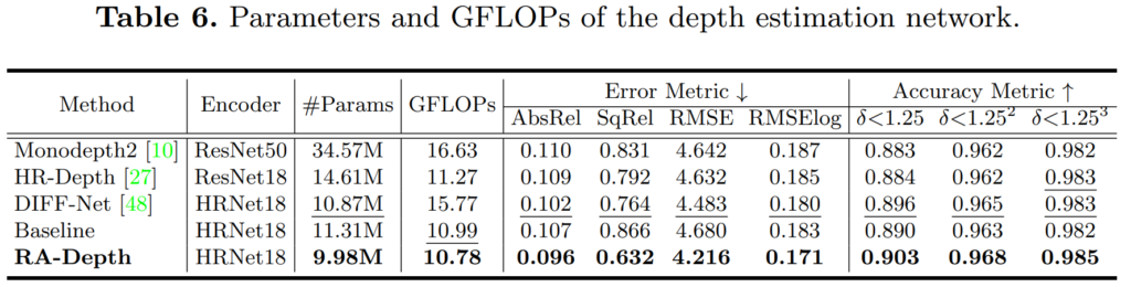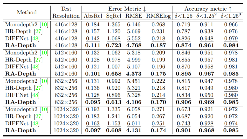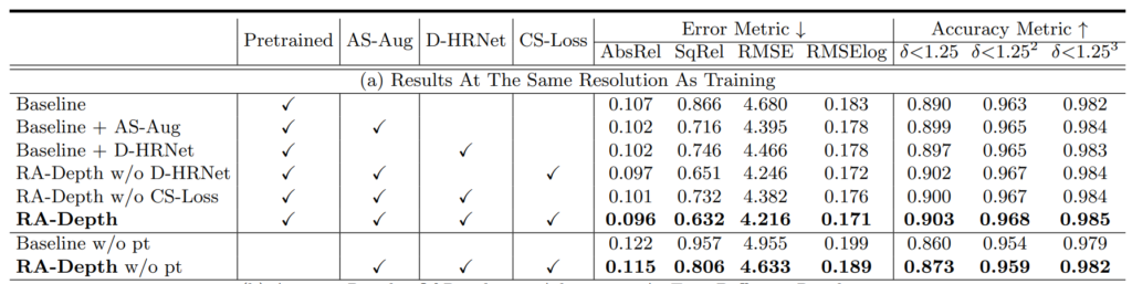 반면에 제안하는 RA-Depth의 경우에는 저해상도 입력이 들어오더라도 성능의 하락이 그리 크지 않았으며, 반대로 고해상도의 입력이 들어올 경우에는 특정 메트릭에서 성능 향상이 있는 등 상당히 해상도 변화에 강건한 모습을 보여주고 있습니다.