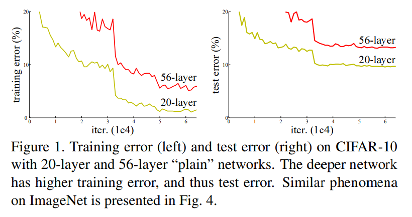 Deep convolution neural network는 image classification task에서 획기적인 발전을 이뤄냈습니다. 최근의 모델들을 여러 task에서 모델의 깊이가 깊어질 수록(16 ~ 30 layer) 좋은 결과를 낸다는 것을 밝혀줬지만, 모델의 깊이가 깊어질 수록 모델의 수렴을 방해하는 gradient vanishing문제가 생깁니다. 기존의 연구들은 이 문제를 normalized initialization, normalized layers등을 사용하며 10~30 layer의 네트워크를 수렴하게 할 수 있었지만, 그보다 더 깊은 네트워크에서 수렴하기 시작하면 degradation 문제가 생겨 수렴에 어려움이 생깁니다: 네트워크의 깊이가 깊어짐에 따라 정확도가 어느순간 급격하게 저하된는 현상. 이러한 degradation 문제는 ovefitting으로 인한 문제가 아닙니다. 밑의 Figure 1.에서 알 수 있듯, training error는 적지만, test error가 커지는 양상의 oveffing과는 달리 training error, test error 모두 층이 더 적을 때보다 커지기 때문입니다.