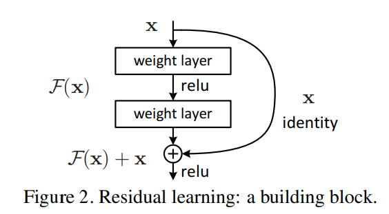 수식적으로 기존의 underlying mapping을 H(x)라고 할때, F(x) = H(x) – x. 즉, 기존의 매빙 방식인 H(x)가 레즈넷에서는 F(x) + x가 됩니다. 이는 identity mapping이 optimal(x -> x)할때, x가 layer를 거치며 H(x)를 x로 근사시키는 것보다 F(x)를 0으로 근사시키는 것이 더 쉬울것이라는 가정에 기반한 것으로 ‘기존의 input대비 달라지는 정도(resudual)’를 학습시키는 것을 의미합니다.