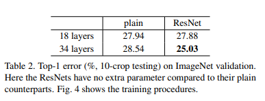 Table 2.는 plain에서 나타나는 error와 resnet에서 나타나는 error를 확인할 수 있습니다. resnet을 적용하는 것은 깊은 모델에서의 학습의 수렴을 도와주려고 고안된 만큼 상대적으로 얕은 모델에서는 plain과 성능이 비슷한 것을 확인할 수 있습니다. 하지만, 학습의 초기단계에서 더 빠르게 수렴하는 것을 Figure 4.에서 확인할 수 있습니다.