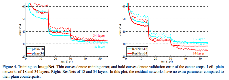 Fig.4의 왼쪽를 확인하면 degradation문제를 볼 수 있습니다. 34-layer모델의 오류가 더 큰 것을 확인할 수 있습니다. 이러한 문제는 training error가 더 깊은 모델에서 높은 것으로 training error는 더 높지만, test할때 error가 커지는 overfitting의 문제는 아닐뿐더러 gradient vanishing문제와는 관련이 없습니다. plain network에서 BN을 적용했고, 저자가 확인해 보았을때 forward, backward 모두 gradient vanishing은 없었기 때문입니다. 반면 오른쪽의 ResNet에서는 더 깊은 모델의 training error가 더 낮게 나오는 것을 볼 수 있습니다.