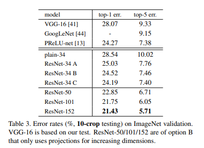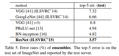 34-layer 모델은 기존의 SOTA모델과 비슷하지만, 152-layer 모델은 단일 모델로도 기존의 SOTA보다 4.49% 좋은 성능을 보였고 6개의 다른 깊이의 모델을 앙상블 하는 것으로 3.57%의 성능을 달성하여 기존의 모델보다 훨씬 더 좋은 성능을 달성함과 동시에 사람의 오차인 5퍼센트보다도 더 좋은 성능을 내 사람을 뛰어넘는 성능을 보입니다.