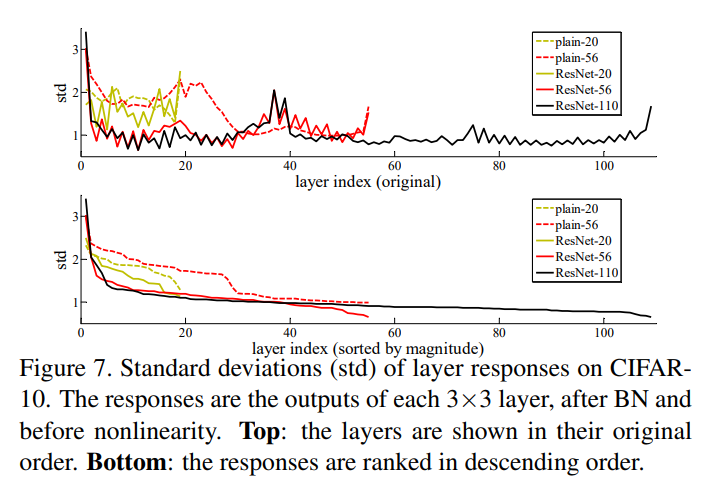 마지막으로 Figure 7.은 CIFAR-10 데이터셋에서 layer response를 나타내는 그래프입니다. Residual Learning은 identity mapping이 깊은 모델에서 학습이 수렴을 하는데 도움을 주는 핵심이라고 생각했고, shortcut을 도입해서 input x를 넘겨주는 것으로 layer마다 변화를 최소화시키는 것으로 degradation문제를 해결하려했습니다. Figure 7.의 그래프는 위의 주장을 증명하고 있습니다.