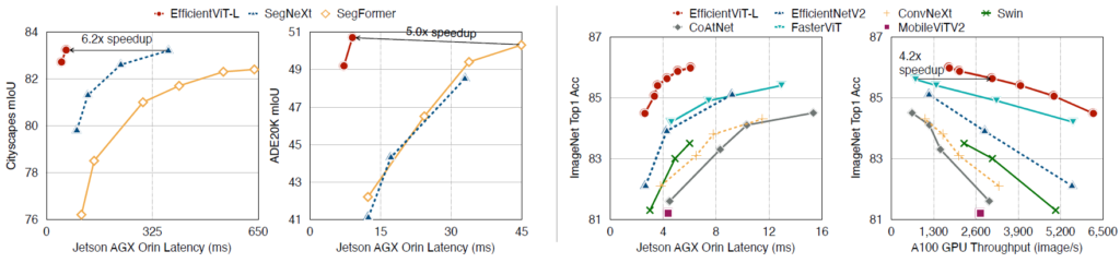 이러한 설계 끝에 만들어진 EfficientViT는 SegNeXt와 SegFormer와 비교하였을 때 성능은 비스샇거나 더 높으면서 속도는 5배 이상 빠른 모델을 만들 수 있다고 합니다.(그림2 참조)