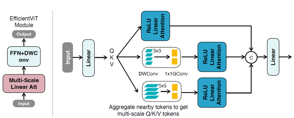 그 결과 1) softmax 기반이 아닌, RELU Linear attention을 통해서 global receptive field를 확보하였고, 2) 컨볼루션 레이어를 적절히 섞어서 local information에 대한 부족한 부분을 보충하고, multi-scale linear attention module을 통해 RELU linear attention의 성능 한계를 극복하였다고 합니다.
