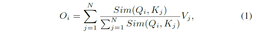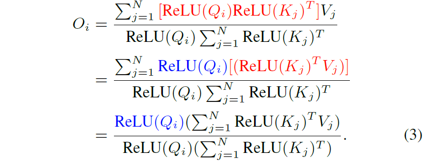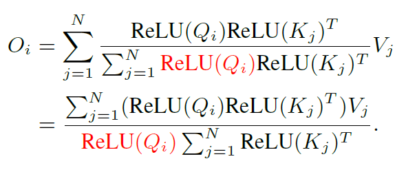 즉 수식2와 같이 Sim을 Query와 Key에 각각 ReLU activation을 적용한 후, 둘 사이에 내적을 하는 것으로 바꿔버리는 것이죠. 이렇게 하게 될 경우 수식1의 self-attention 수식을 아래와 같이 다시 쓸 수 있습니다.