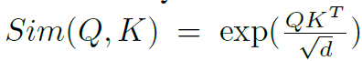 여기서 Q와 K와 V는 각각 x에다가 fc layer를 태워서 만든 것으로 이해하시면 됩니다. Sim() 함수는 두 행렬의 유사도를 측정하는 함수로 보통 아래 수식과 같이 Query Key 간에 내적 후 softmax를 취하곤 하죠.