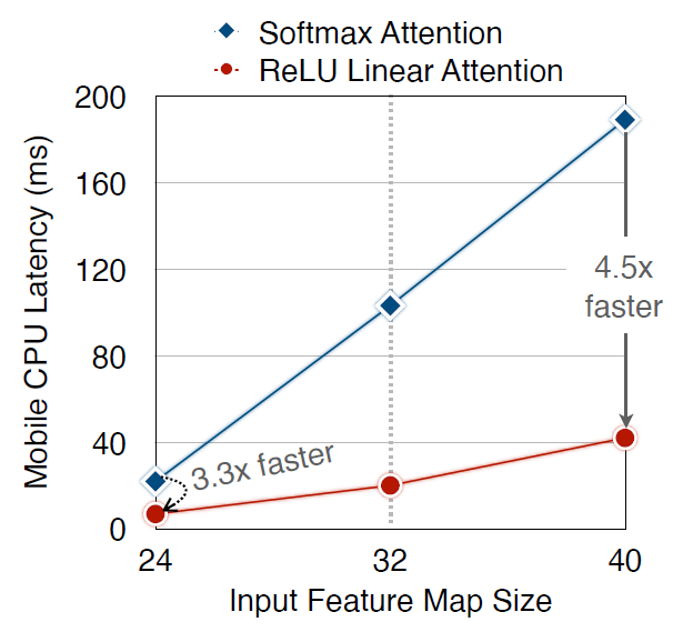 실제로 이렇게 연산을 하게 될 경우에 입력으로 사용되는 feature map의 사이즈에 따라서 mobile cpu latency가 softmax attention과 비교하여 최대 4.5배 더 빠르다고 합니다.(그림4 참조)