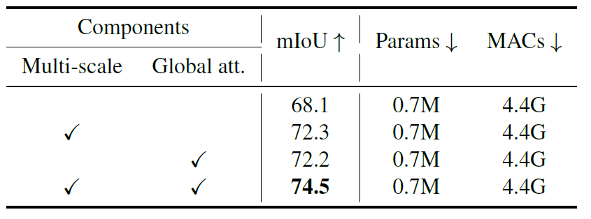 Multi-scale은 Multi-scale Learning을 위해 Q/K/V 각각에게 3×3, 5×5 커널 사이지를 가지는 DWConv를 태워서 ReLU Linear Attention을 수행한 것을 의미하며, Global Attention은 말그대로 ReLU Linear Attention 사용 여부를 말하는 것으로 보여집니다. 보시다시피 각각의 모듈들은 Cityscape의 Semantic Segmentation에서 중요한 성능 향상을 보여주고 있습니다.