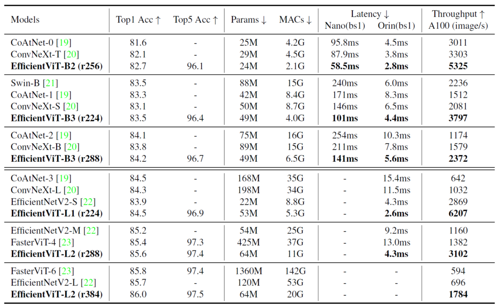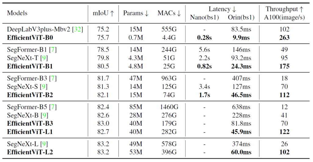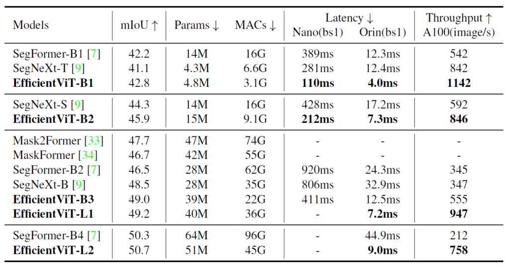 아무튼 여기서 중요한 점은, multi-scale learning과 global attention은 dense prediction task에서 상당히 중요한 역할을 한다는 점이며, 저자가 제안하는 EfficientViT module이 그 역할들을 충실히 수행해주고 있다는 점입니다.