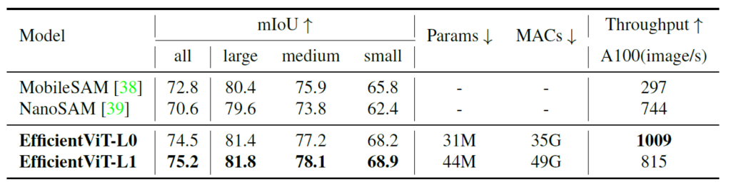 그 결과 COCOVal2017에서 zero-shot learning으로 MobileSAM, NanoSAM보다 더 좋은 성능을 기록하면서 throughput은 더 빠르게 가져갈 수 있었다고 합니다.