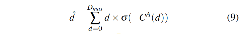 이는 전통적인 SGM과 3가지 방면에서 다른 점이 존재합니다. 먼저, 직접 사전에 정의해줘야 했던 파라미터들을 학습 가능하도록 만들었으며, 이를 matching cost의 패널티 계수와 가중치로 사용되도록 하였습니다. 그럼 이런 가중치들은 서로 다른 상황에서 adaptive하게 동작할 수 있겠죠. 두번째로 식 3에서 minimum 값을 선택해서 사용했던 것과는 다르게 식 4를 보면 가중합을 하도록 변경했다는 것을 확인할 수 있습니다. 이는 타 논문에서 사용한 방식을 인용한 것입니다. 마지막 세번째로 식3의 내부 식 마지막 줄에서 minimum 값을 사용하던 것을 maximum 값을 사용하도록 변경하였습니다. 이는 본 모델에서 학습 타겟이 matching cost를 최소화하는 것이 아닌 gt depth에서의 확률을 최대화하는 것이기 때문입니다.