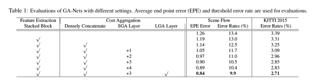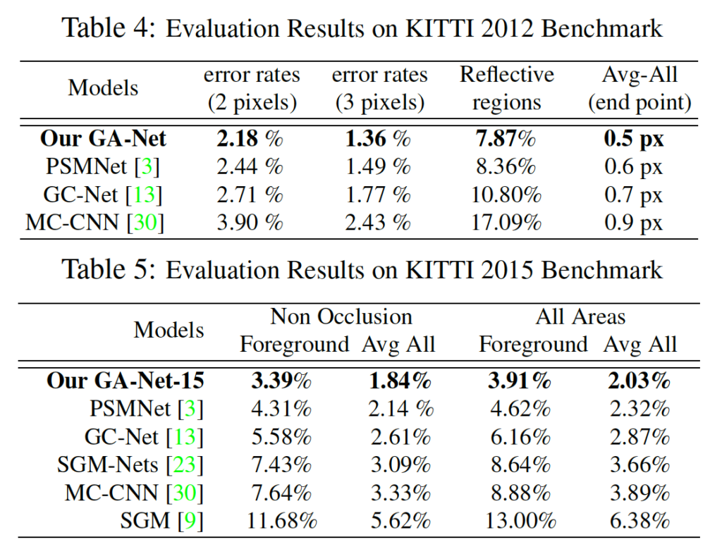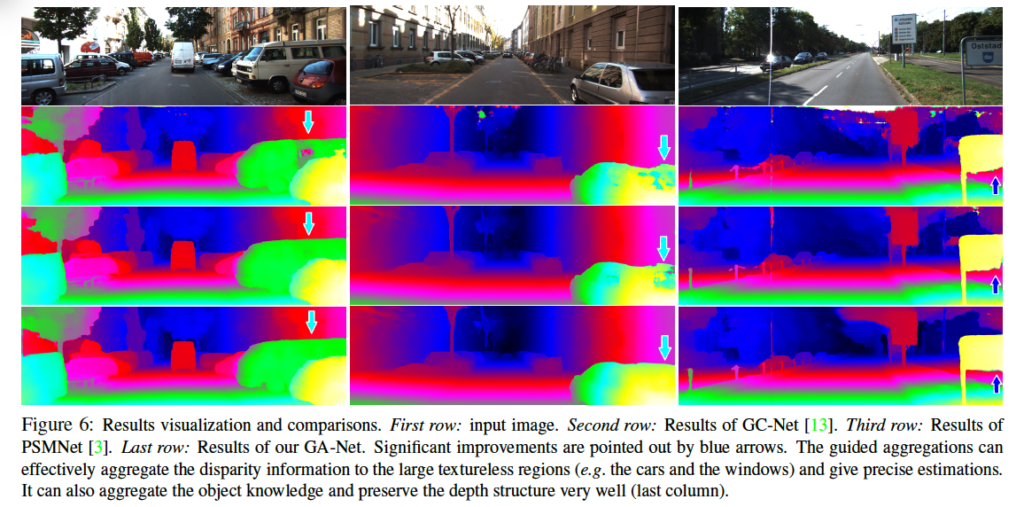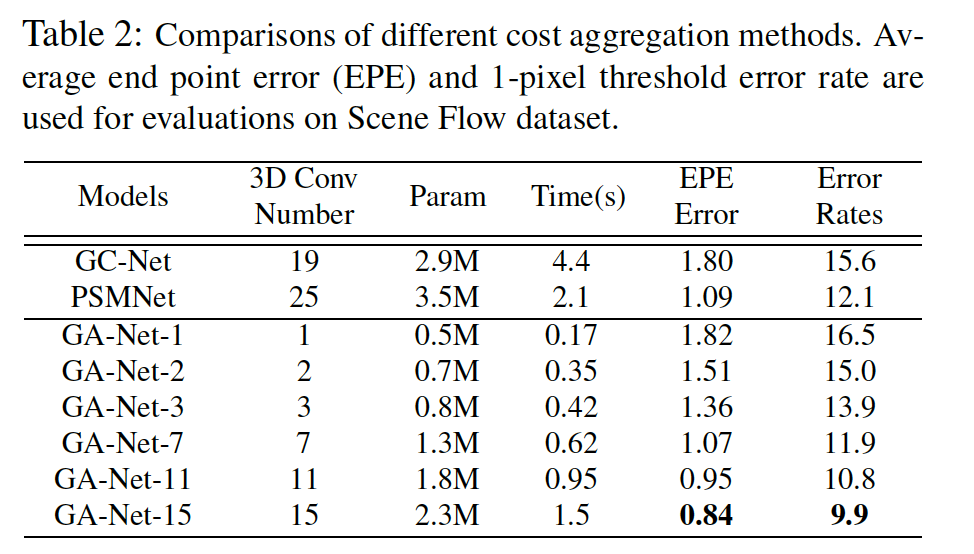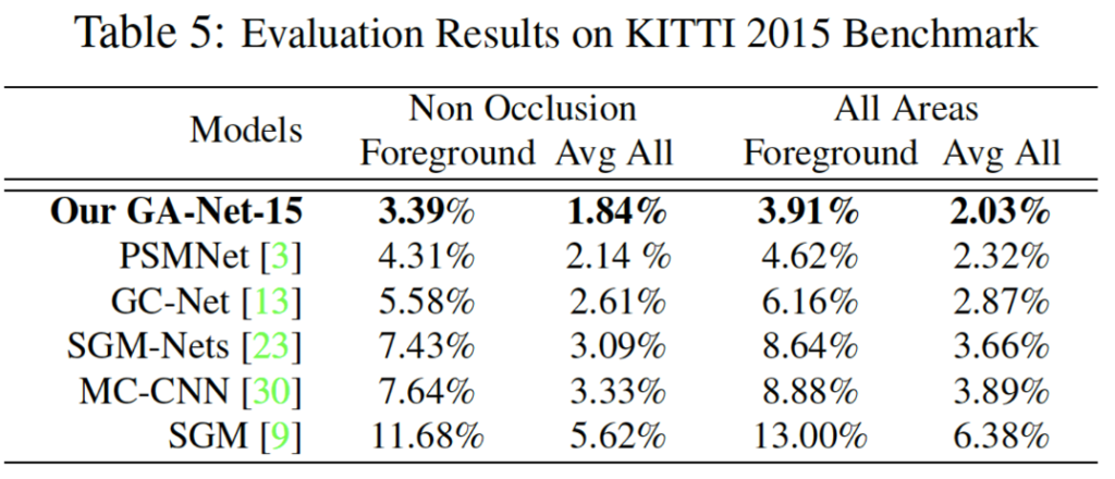 위 표 5를 보면 handcrafted 특징을 사용한 기존 SGM와 CNN 기반으로 추출한 특징을 사용한 MC-CNN과 비교해보았을 때 본 논문의 GA-Net은 훨씬 좋은 성능을 보입니다. 이는 SGA가 end-to-end로 학습가능한, 미리 사전에 정의해야 하는 파라미터가 없기 때문이라고 볼 수 있으며 SGA의 aggregation은 guidance subnet에서 얻어낸 weight을 사용하기 때문이라고 볼 수 있겠습니다.