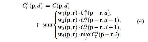 본 논문의 저자는 역전파 할 수 있는 새로운 semi-global cost aggregation step을 제안합니다. 이는 전통적인 SGM보다 훨씬 효과적이며 dnn 모델에서 사용될 수 있죠. 제안된 aggregation 단계는 아래 수식 4에서 살펴볼 수 있습니다.