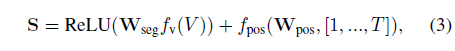 위 수식 (3)에 따르면, 실질적으로 후에 사용되는 video feature S는 3D encoder를 타고 나온 비디오 embedding f_{V}(V)에 FC layer + ReLU를 태운 뒤 positional encoding을 더해준 형태라고 이해할 수 있습니다. 저자에 따르면 positional encoding은 TSGV task가 temporal localization인 만큼 필수적인 과정이라고 하네요.