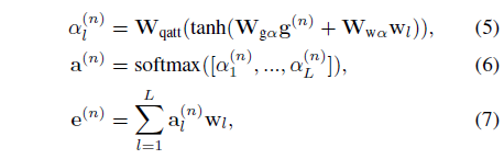 위 과정을 거쳐 얻은 guidance vector를 활용해 현재인 n번째 단계의 semantic phrase feature e^{(n)}을 만들어줄 수 있습니다. 이 과정은 아래 수식 (5), (6), (7)과 같은데, 설명과 함께 하나씩 살펴보겠습니다.