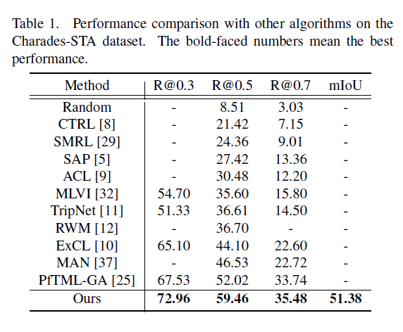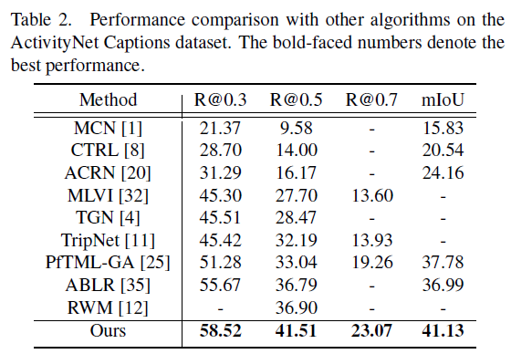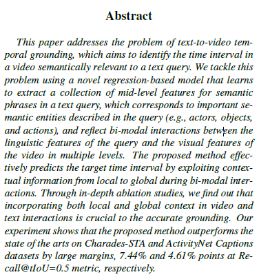 - Outperforms the SOTA by a large margin on both Charades-STA and ActivityNet Captions datasets