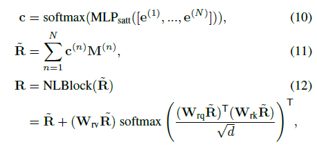 이는 수식 (10), (11), (12)에 따라 진행됩니다. 우선 수식 (10)을 통해 총 N개의 semantic phrase feature들의 score를 추출하게 됩니다. 이 attention score들은 수식 (11)에서 각 단계의 segment feature M^{(n)}에 가중치로서 적용되며 이후에는 넓은 범위의 global context를 주입해주기 위해 Non-Local block(NLBlock)의 입력으로 들어가게 됩니다.