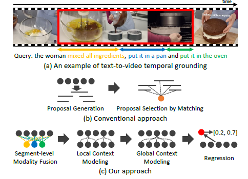 이 방식은 각자의 알고리즘을 활용해 비디오로부터 여러 개의 proposal을 만들어내고(scan), 하나로 만든 query feature와의 matching을 통해 경계를 회귀하여 예측을 만들어냅니다. 핵심은 query 문장 내 다양한 fine-grained semantic을 무시한 채 단 하나의 global feature로 만들고 proposal들과의 matching을 수행한다는 점입니다. 이렇게 되면 query를 쪼개어 fine-grained level로 살펴보았을 때 포착할 수 있는 세부정보들이 무시될 수 있으며 localization에 최적이라고 보기 어려울 것입니다. 결국 저자가 이야기하는 semantic phrases는, 앞서 예로 들었던 text query를 의미를 가질만한 작은 단위인 [‘mixed all ingredients’, ‘put it in a pan’, ‘put it in the oven’](그림 1-(c)에서 색칠된 동그라미)을 의미합니다.