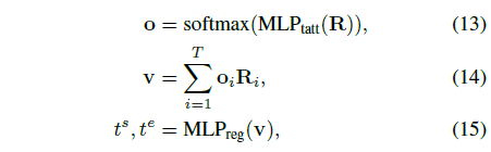 이제 여러 과정을 통해 local context, global context를 multi-modal feature R에 담았으니 이를 이용해 구간을 예측해야합니다. 이 과정은 아래 수식과 같습니다.