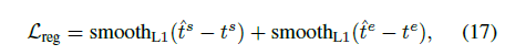 TSGV에도 weakly-supervised가 존재하지만 현재는 Fully-supervised이므로 학습 중 query에 대한 GT 시간 구간을 활용할 수 있습니다. \mathcal{L}_{reg}는 [0, 1]사이로 정규화된 시간 구간과 모델의 예측 시간 구간을 smooth L1 loss로 regression하는 역할을 수행합니다. TSGV 학습을 위한 가장 기본적인 loss인 것으로 보입니다.