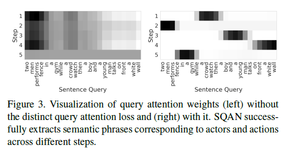 SQAN은 앞서 설명한 수식 (2)의 f_{e}(\cdot{})입니다. f_{e}(\cdot{})는 저자의 의도에 맞게 query에서 중요 요소에 해당하는 actors, objects, actions 등을 더 잘 찾도록 하기 위해 문장을 쪼갤 수 있어야 합니다. 위와 같은 semantic phrase에 대한 GT는 없기에, 저자는 query 내 semantic phrase가 단어의 연속으로 구성된다는 가정을 깔게 됩니다.