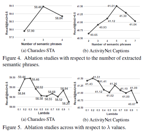 그림 5는 중요한 하이퍼파라미터 두 가지에 대한 ablation 성능입니다. 각각 추출하는 semantic phrases의 개수와 \mathcal{L}_{dqa}에 사용되는 \lambda{}입니다. 각 변수를 조정할 때마다 성능 차이가 꽤나 큰 것을 볼 수 있습니다.